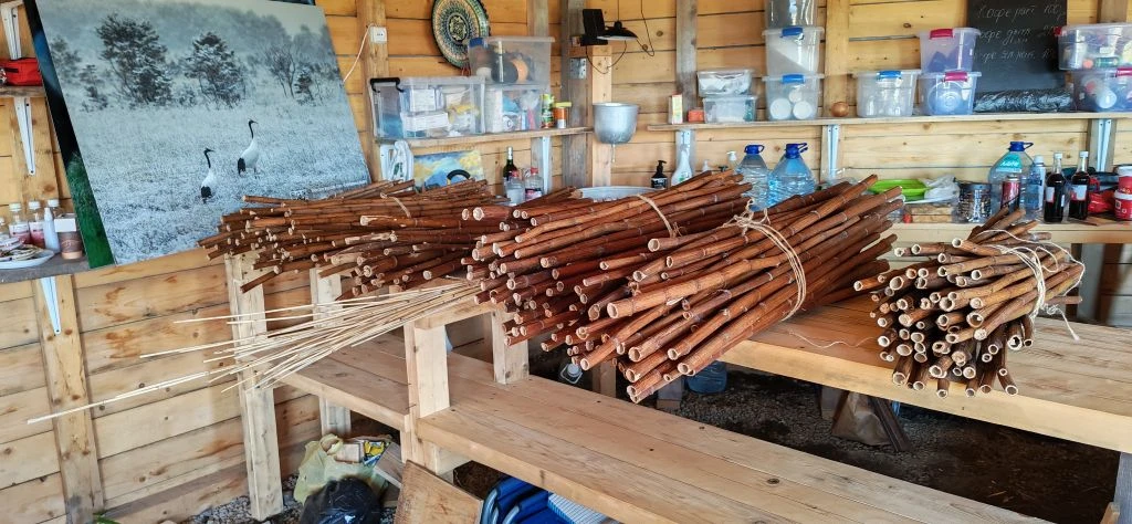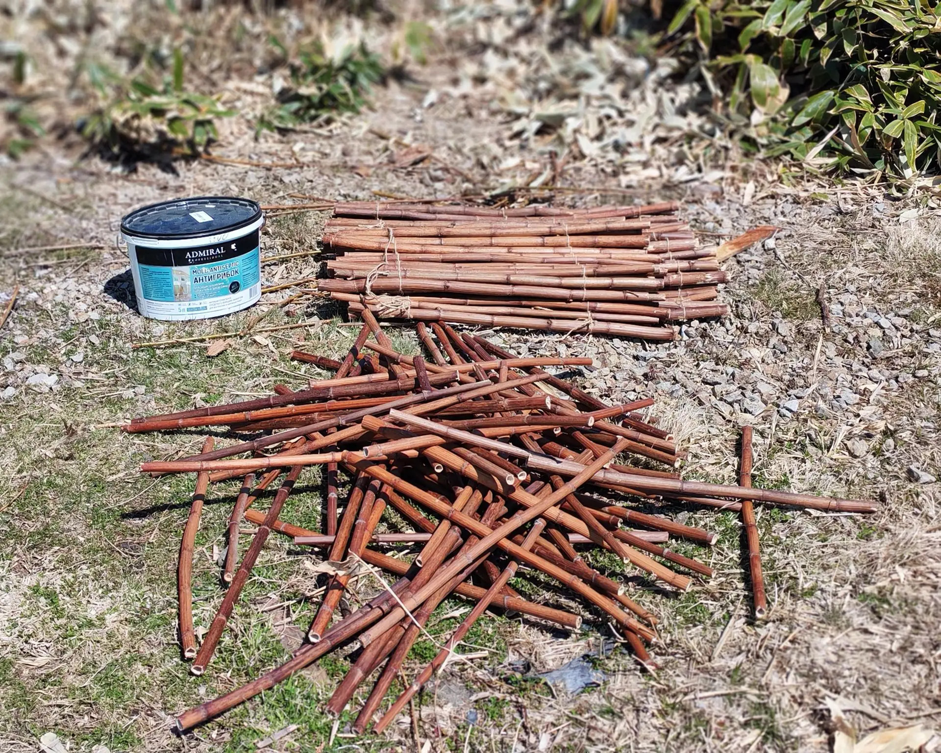 Рейнутрия на панели собиралась не одномоментно: часть красивая, яркая, сухая — октябрьская, часть декабрьская, вымоченная дождями,серая, в пятнах... Может, кто-то помнит, как я две зимы назад каждый декабрьский стебель прокалывала шампуром, заливала внутрь антисептик и мыла, мыла изнутри антигрибковым составом? — и, вот, держится, до сих пор. А октябрьская продержалась эти полтора года даже и без обработки. По некоторым кускам стеблей плесень все же пошла — это ведь всего лишь трава — пришлось выбросить.