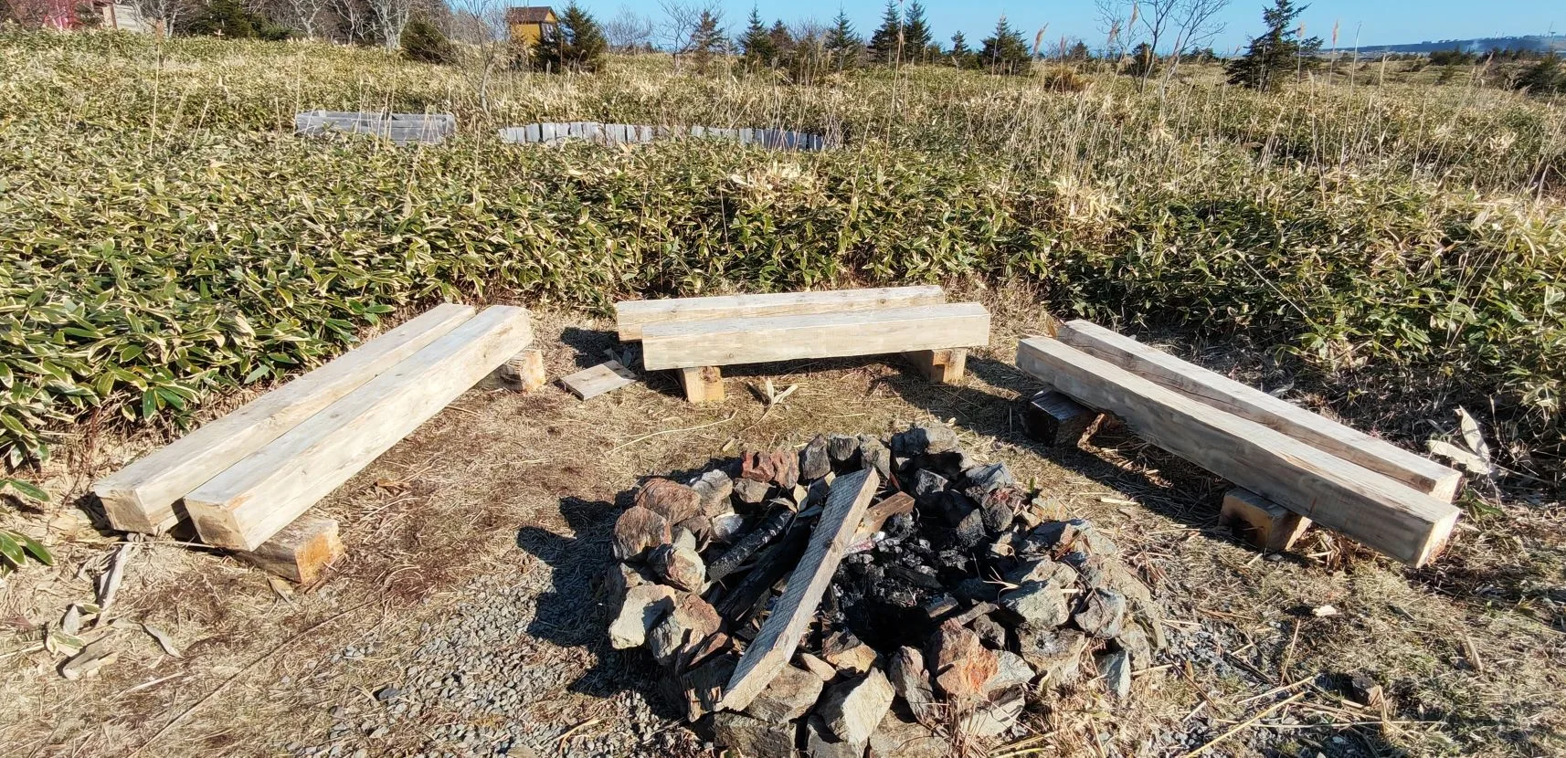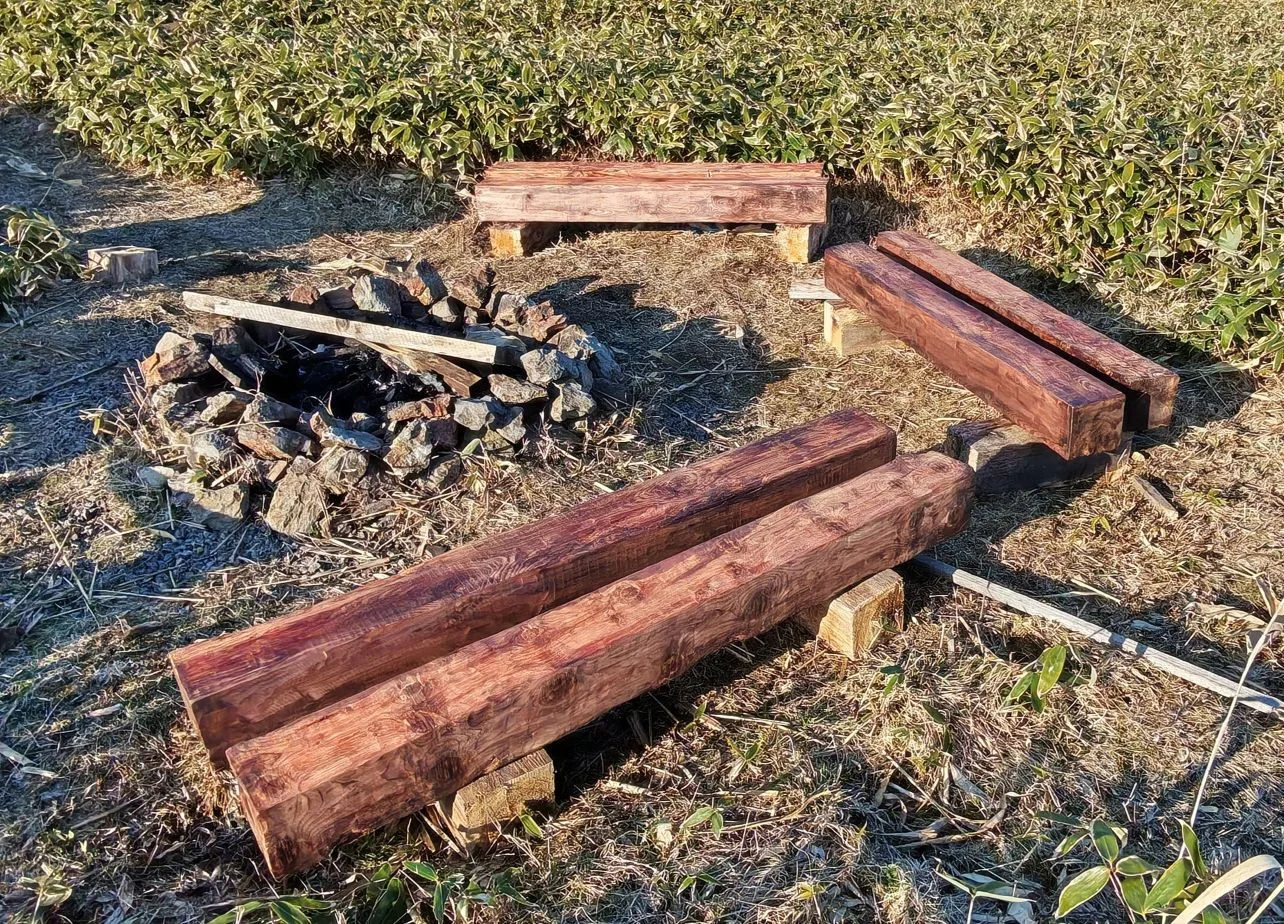 Всë, бревна сохнут, стойки стендов (тех, что не убирались на зиму) покрыты морилкой, бутылок пустых — как у алкоголика со стажем...