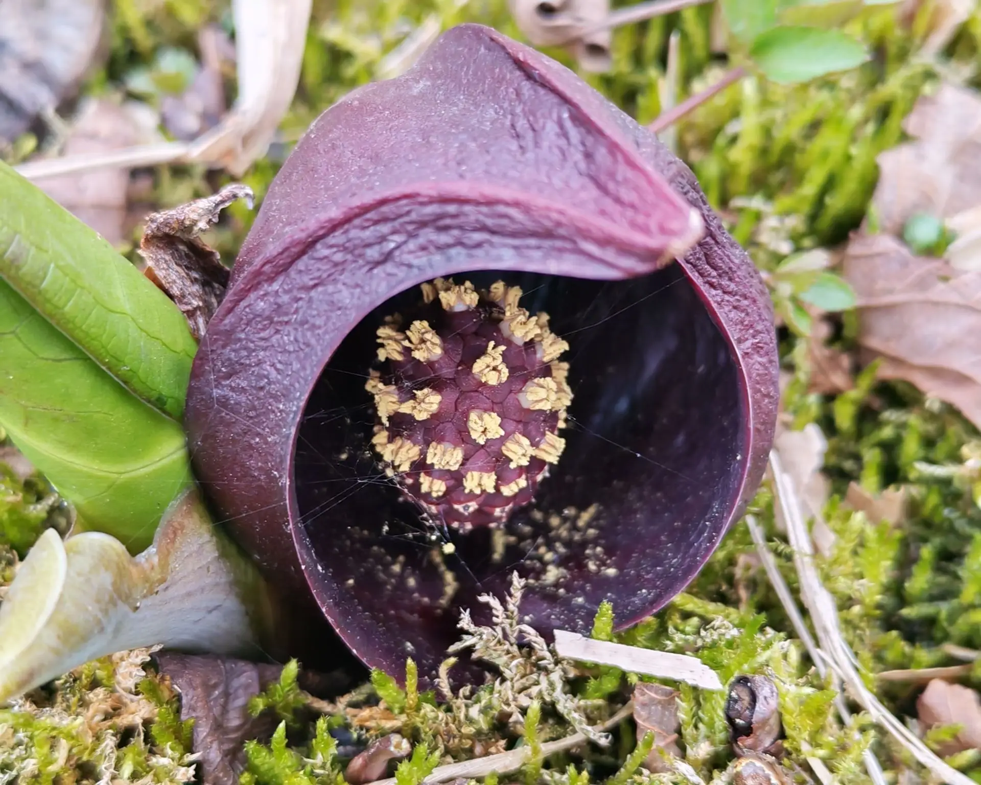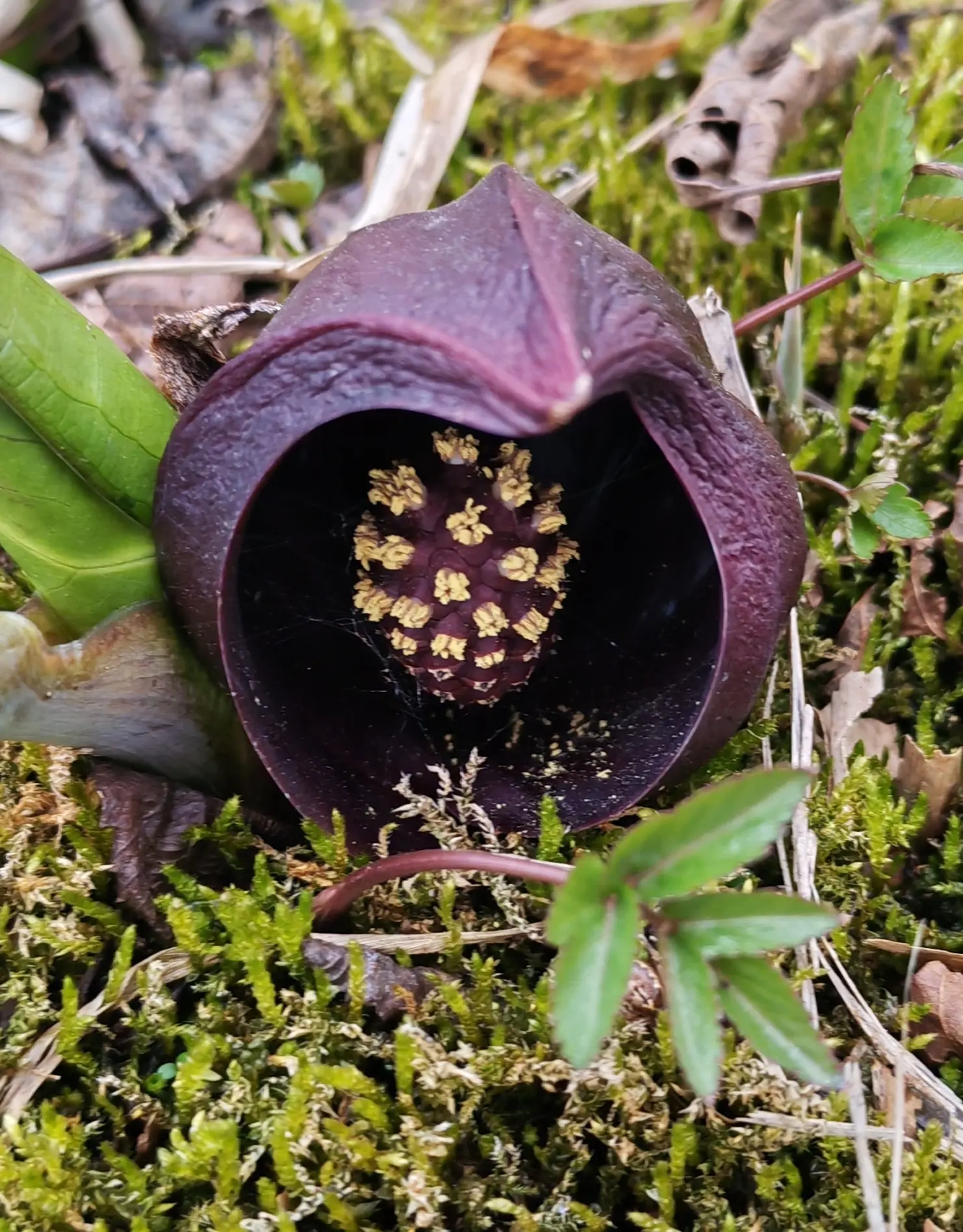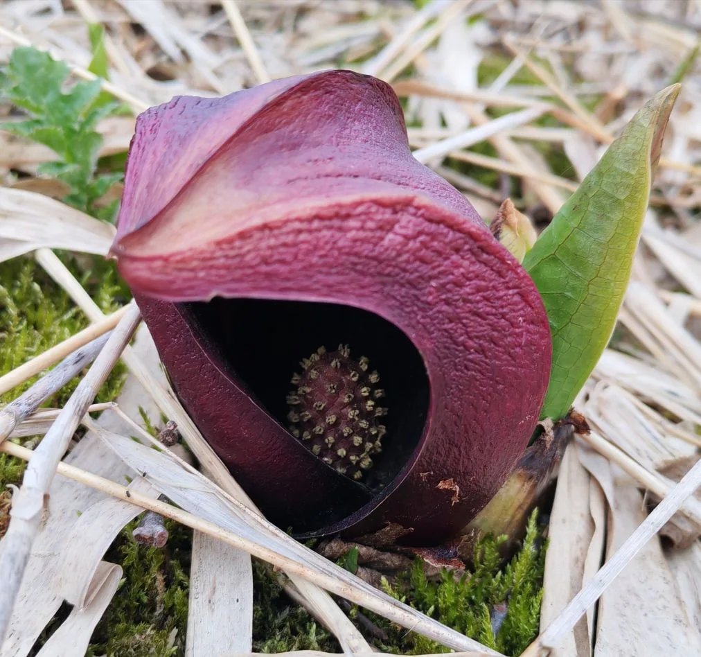 Я его обожаю за удивительный цвет и инопланетный вид — толстое бордовое покрывало похоже на лоскут кожи. Под ним, как в капюшоне, прячется початок соцветия.