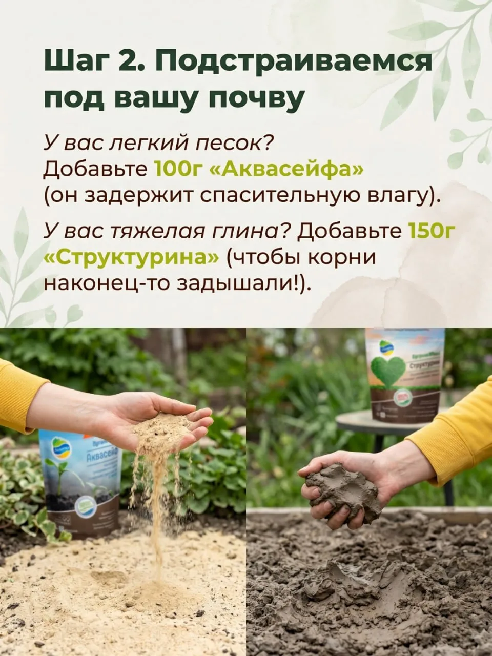 ▪️ Если у вас песчаная почва (вода быстро уходит), добавьте 100 г «Аквасейфа» для удержания влаги.