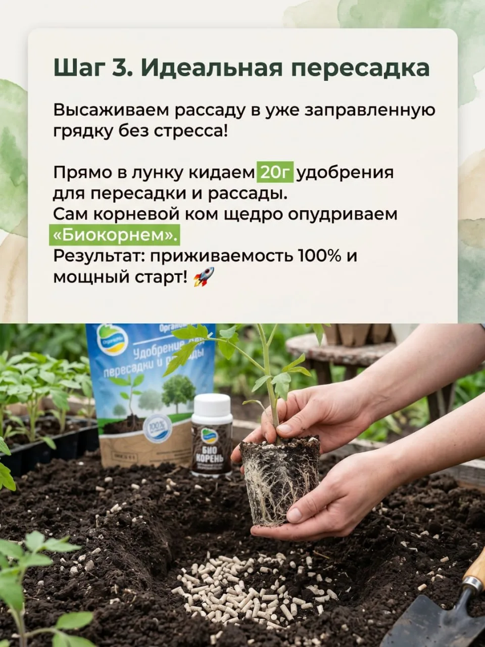 При пересадке в грунт растения теряют до 30% энергии на адаптацию. Чтобы приживаемость была стопроцентной, добавьте в каждую лунку 20 г Удобрения для пересадки и рассады, а корневую систему обработайте «Биокорнем».