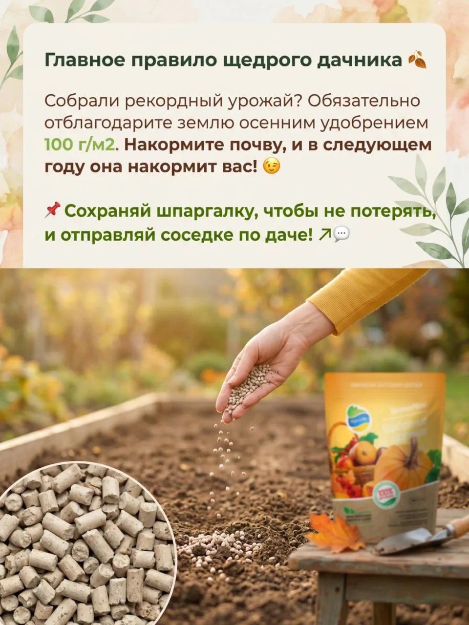 После сбора урожая почву необходимо восстановить. Внесение осеннего удобрения (100 г на кв.м) вернет плодородие и подготовит землю к следующему сезону.