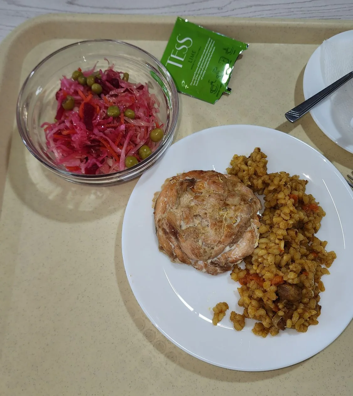 Сегодняшний обед: половинка булгура 🍚, к которому пришлось добавить горбушу 🐟, так как мяса в нем было совсем немного. Салат из капусты 🥬 и чай без сахара 🍵.
