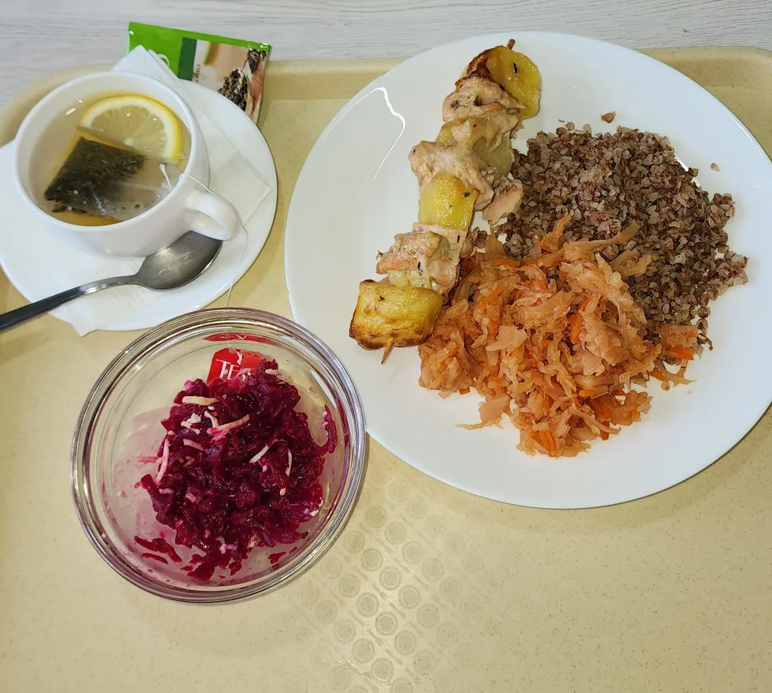 В меню были рыбный шашлычок с картофелем 🍅🥔 и микс из гарниров по пол порции (гречка/тушёная капуста) 🍚. Чай, как всегда, без сахара 🍵.