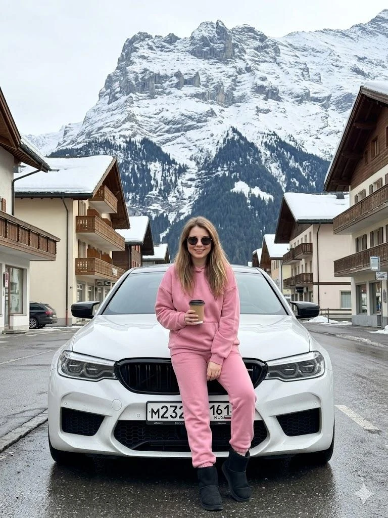 ULTRA REALISTIC 8K PHOTO, MY FACE IS 100% SAVED EXACTLY AS UPLOADED. THE GIRL, BENDING DOWN NEAR THE HOOD, LOOKS AT THE CAMERA, THE BODY IS SLIGHTLY TILTED FORWARD, LEANING ON THE CAR, NEXT TO A white BMW M5 COMPETITION.THE GIRL IS WEARING A PINK OVERSIZED TRACKSUIT, BLACK UGG BOOTS, SUNGLASSES, HER RIGHT HAND IS HOLDING A cup OF coffee, HER LEFT HAND IS DOWN. BMW white METALLIC WITH REALISTIC LICENSE PLATES, RUSSIAN M232MM161 CLOUDY SOFT DAYLIGHT, COMPLETELY HARSH. THE CENTRAL ELEMENT OF THE COMPOSITION IS A HIGH, SNOW-COVERED MOUNTAIN. THE MOUNTAIN HAS ROCKY PEAKS AND IS PARTIALLY COVERED WITH FOREST. IN THE FOREGROUND, THERE IS A STREET PAVED WITH ASPHALT THAT LOOKS WET, POSSIBLY AFTER THE RECENT SNOWMELT. BUILDINGS TYPICAL OF THE ALPINE STYLE ARE LOCATED ON BOTH SIDES OF THE STREET. THESE HOUSES HAVE SLOPING ROOFS COVERED WITH SNOW AND WOODEN BALCONIES, SOME BUILDINGS ARE PAINTED IN LIGHT COLORS SUCH AS WHITE AND BEIGE, WHILE OTHERS HAVE DARKER WOODEN FACADES. NO BLURRING, NO CHANGING OF FACE OR POSTURE, NO CG. LONG HAIR SHINY SMOOTH, DON'T CHANGE YOUR FACE, THE PHOTO WAS TAKEN ON AN IPHONE 17 PRO MAX WITH A FLASH, DON'T CHANGE YOUR FACE.