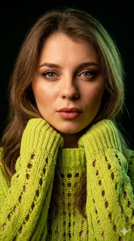 Create a portrait without changing your facial features. Close-up of a young woman with long wavy hair. She has expressive green-brown eyes. Flawless makeup, radiant eyelashes, powdery brown lips with a light gloss. Skin with a natural texture and light freckles, makeup in warm tones with an emphasis on full lips. She is wearing a textured knitted sweater in bright lime color with a hole pattern. Her hair is tucked into a sweater slightly. The lighting is dramatic, studio-like, against a dark background. High detail, cinematic look. Portrait of a girl in the style of "high fashion". Aesthetics of contrasts: bright green mesh knitwear and deep shadows. The face is illuminated by a soft side light, emphasizing the cheekbones and skin texture. A magical look, a deep black background, minimalism, an emphasis on lime color and facial details. A warm light with a slight greenish neon glow falls on the face. Textured lime sweater is translucent with large holes of coarse knitting. Lighting scheme: Rembrandt lighting. 85mm lens, f/1.8. High resolution, 8k photorealism, detailed skin pores, soft lip highlights. The texture of the sweater from the second reference . 9:16