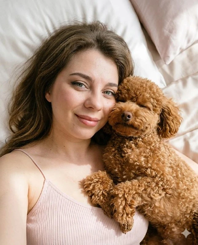 Создай селфи, не меняя черты лица. Фотореалистичный портретный снимок, сделанный с верхнего ракурса на расстоянии вытянутый руки (камера расположена прямо над лицом, лёгкий наклон вниз), крупный план. Молодая девушка лежит на кровати, голова слегка повернута к камере, лицо занимает левую часть кадра. Рядом с её щекой прижат той пудель , также лежащий на спине или боку, его мордочка обращена к камере, глаза закрыты, выражение расслабленное и умиротворённое. Композиция очень интимная и уютная, кадр вертикальный. Девушка и питомец находятся максимально близко друг к другу, создаётся ощущение тепла и доверия. Фон — светлое сатиновое бельё. Освещение естественное: мягкий солнечный свет из окна падает сбоку сверху, Девушка с безупречным макияжем, милая улыбка. кожа с легким загаром. Волосы естественно красиво лежат вокруг головы. На ней домашний нежно розовый топ на тонких бретелях. Стиль съёмки — реалистичная фотография, эффект плёночной камеры или мягкой цифровой обработки, без чрезмерного сглаживания. Высокая детализация, естественные цвета, лёгкое зерно, ощущение настоящего момента. Объектив 35–50 мм, малая глубина резкости, фокус на лицах. Качество — ultra realistic, photorealism, natural skin texture, real light, candid moment. Формат 4:5