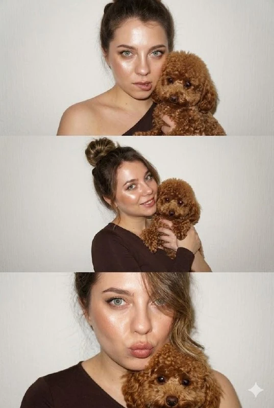 Создай Вертикальный коллаж из трех фото Y2К, не меняя черты лица. Женщина с собакой мини мультипу позирует на нейтральном светлом фоне. .блестящая кожа, безупречный макияж. . На первой фотографии она смотрит в камеру ,прикусывая нижнюю губу , на втором кадре развернуто и голова кокетливо повернута к объективу, укладка не много прикрывает ее лицо, но не сильно. на третей фотографии, она смотрит в объектив, очень близко, укладка на бок и тем самым закрывая левый глаз, она дует губки бантиком и смотрит вперед. Везде прижимает к себе собаку. Крупный и средний план, минималистичная композиция, винтажная цифровая текстура, легкая размытость, гламурная атмосфера. Фото сделано на iPhone 17 Pro Max со вспышкой внешность и макияж. • Лицо: Кожа имеет сияющий финиш с выраженным использованием хайлайтера на скулах, лбу и переносице. На щеках заметны персиково-розовые румяна. • Губы: Губы пухлые с пудрово коричневым оттенком • Прическа: Волосы в высоком пучке волнистые длинные , немного растрепанные. Наряд и аксессуары • Одежда: лонгслив темно коричневый на одно плечо(одно плечо и рука открыты)