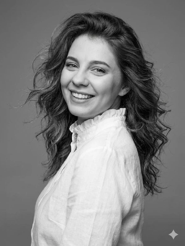 A черно-белое студийное портретное фото с моего референса искренней, радостной улыбкой, смотрящей в камеру. Её тело повернуто на 3/4 влево, голова повернута вправо, правое плечо приподнято. Её собственные волосы [REPLACE WITH YOUR HAIR REFERENCE] уложены с большим объемом, волнами и динамичным движением, развевающимся на ветру. Она одета в ту же белую льняную блузку с воротником-стойкой с рюшами. Чистый, равномерный серый фон. Мягкое, равномерное студийное освещение. Крупный план до плеч.