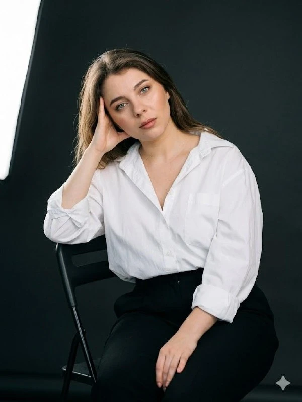 A photorealistic studio portrait of a woman, do not change her facial features in a relaxed, elegant pose, sitting on a folding metal chair. Clothing: a white loose shirt with an unbuttoned collar and rolled-up sleeves, partially tucked into black classic trousers with a high waist. Posture: the body is slightly tilted back, the right hand rests at the temple / nape, the left hand is relaxed on the hip, the neck and collarbones are visible. Lighting: soft softbox on the top left, subtle backlight to separate from the background, deep black background, soft shadows, moderate contrast. Atmosphere: minimalistic, fashionable, cinematic, sustained aesthetics of editorial shooting. Style and detail: photorealism, natural textures of fabric and skin, careful retouching, light film grain. Technical parameters for the generator: 50mm lens, f/1.8, low depth of field, vertical composition from chest to knees, warm skin tones, smooth color correction. Exceptions: no logos, watermarks, or distracting elements.