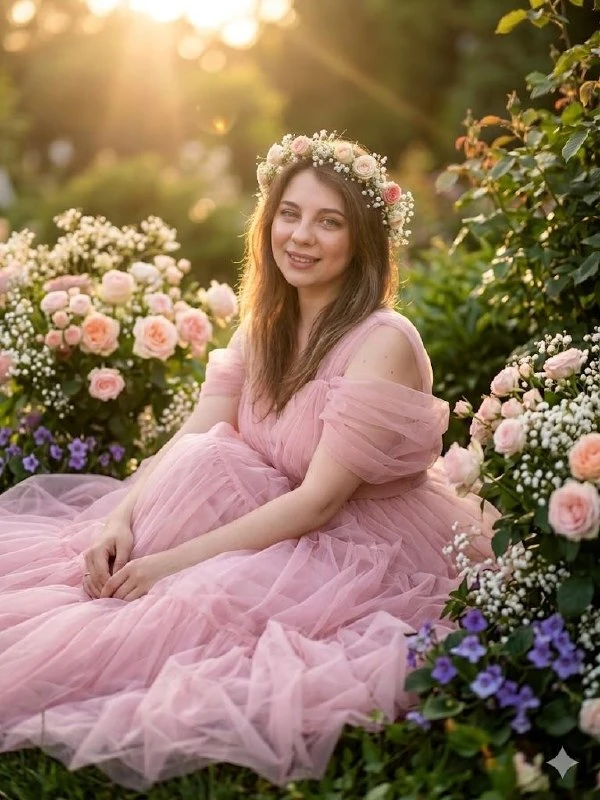Romantic photorealistic portrait of a smiling girl sitting without changing her features in a voluminous airy tulle dress surrounded by lush pastel roses, gypsophila, violets and dense greenery; a small wreath of fresh flowers; warm golden sunset light with soft volumetric rays, delicate highlights, delicate side; dreamy calm pose, smooth airy folds of fabric, detailed color textures, cinematic color correction, soft focus, light film grain for the atmosphere; ultra-detailed, 8k, shallow depth of field, 85mm f/1.4, cinematic lighting.