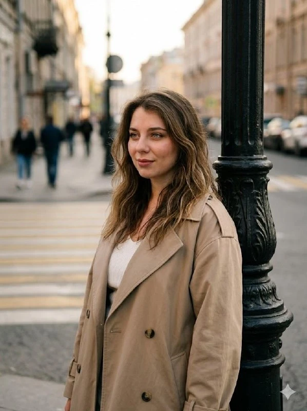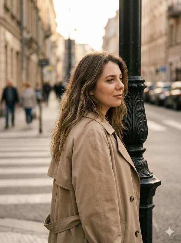 Portrait street shot: a woman wearing a beige oversized trench coat, without changing her features, stands leaning against a decorative cast-iron lantern, relaxed pose, slightly turned in profile, long wavy hair, elegant urban style. Golden hour, soft side warm lighting, cinematic atmosphere, fine film grain, deep side view, blurred urban background with pedestrian crossing and parked cars. Waist-length composition, vertical orientation, moderate contrast, muted beige-brown palette, naturalistic fabric texture, realistic skin and hair, street fashion style, atmospheric, romantic, film studio.