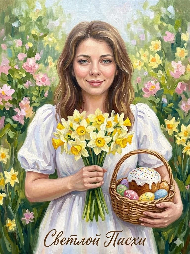 Масляная живопись, пастельные весенние тона. Портрет девушки с фото — лицо, пропорции и черты точно сохранены по загруженному фото. Белое хлопковое платье с пышными рукавами. В руках — пышный букет нарциссов и плетёная корзина с расписными пасхальными яйцами и куличами с белой глазурью и посыпкой. Фон — размытый весенний сад с зеленью и пастельными цветами. Видны мазки и фактура холста. Каллиграфическая надпись: «Светлой Пасхи» Мягкий дневной свет, тёплая палитра, атмосфера уюта. Высокая детализация мазков.