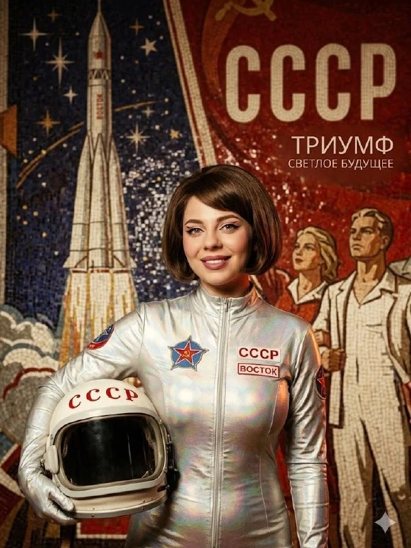 Используя представленное фото, не меняя черт лица создай Стилизованное профессиональное фото женщины в эстетике советского футуризма 1960-х годов. На ней серебристый облегающий комбинезон с нашивками СССР и белый шлем космонавта, который она держит в руках. Прическа — аккуратное каре, макияж с графичными стрелками. Фон: мозаичное панно в стиле соцреализма с изображением ракеты «Восток» и звезд. Теплый пленочный свет, мягкие тени. Цвета: насыщенный красный, белый, стальной. Атмосфера триумфа и светлого будущего. Высокое разрешение, 8k. В свободной зоне сторис чуть