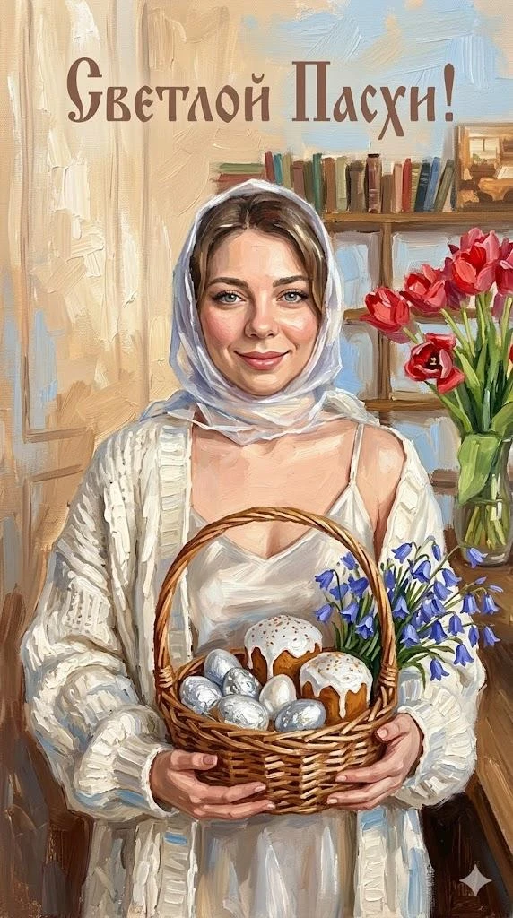 Используя представленные фото не меняя чёрт лица создай открытку на праздник Пасхи в стиле густой , масляной живописи с выраженными мазками (oil painting, heavy brushstrokes). Вертикальное 9:16 фото - молодая женщина в белом уютном укорочении свободном кардигане, крупной вязки уютном, и шелковом платье на голове полупрозрачный белый платок которым покрыты волосы, она держит в руках плетеную корзину с белыми пасхальными яйцами украшенными серебрянной и пасхальными куличами с белой глазурью, и посыпкой. В корзине большой букет колокольчиков.