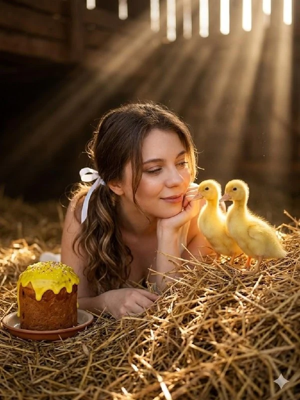Using the presented photos, without changing the facial features, create a close-up photo of the girl's face lying on clean, dry hay. Two yellow ducklings are sitting next to her face, right on the straws. The girl looks at them with a slight smile, resting her chin on her hand. Posture: relaxed and calm. On the left side of the dish is an Easter cake with yellow icing. Lighting: clear, beautiful rays of light fall through the cracks in the roof, illuminating only the face and chickens, leaving the background in soft shadow. Textures: golden hay, soft down, smooth skin. Hair styled in a lower ponytail in soft curls, with a white ribbon or bow. A few strands have escaped and frame the face. Colors: honey, amber, warm brown. Style: artistic portrait, high aesthetics
