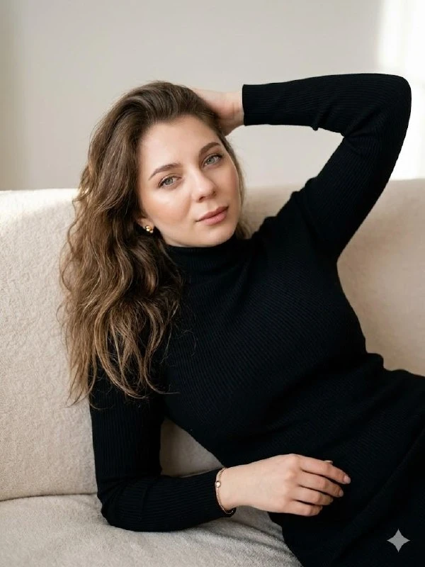 Photorealistic studio photo shoot, close-up of a knee-length woman, do not change her facial features in an elegant tight-fitting black golf dress, reclining on a light neutral background, body slightly turned in three quarters, hand behind her head, gaze into the camera, calm graceful expression. Long dark wavy hair, natural makeup with an emphasis on arrows, warm smooth skin tones, small gold earrings and a thin bracelet. Soft side studio lighting with a light background light to separate from the background, soft shadows, Camera: 50mm, low depth of field (f/1.8–f/2.8), sharp detailed focus on the face and upper body.Atmosphere: elegance, sophistication, minimalism. Color scheme: warm skin tones, rich black dress, neutral beige-gray background. High resolution, ultra-detail, photorealism, soft retouching, high-quality color correction.