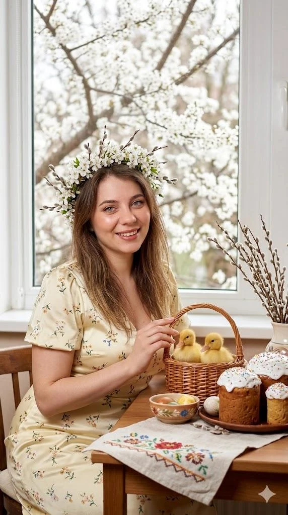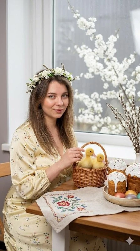 On the table in close-up: 2-3 cakes of different heights with white glaze, next to colored eggs in a bowl, a linen towel / napkin with neat embroidery (without readable letters), a vase with willow twigs Ducklings : 2 small yellow ducklings in a small wicker basket on the side of the frame. The girl smiles softly and gently touches the edge of the basket.