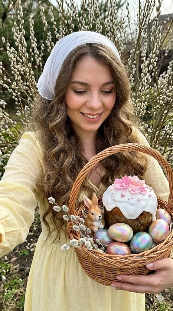 Create a hyper-realistic photo. Format 9:16. A young girl takes a selfie 🤳🏼 on the street among a flowering willow. She holds a large basket with an immaculate cake decorated with pink ornaments on white glaze. There are eggs painted with a multi-colored rub. The Easter bunny figurine is visible in the basket. She looks into the basket and smiles sweetly. The makeup is flawless. Her hair is very long, voluminous and wavy, covered with a white, slightly transparent kerchief. The girl is wearing an airy figure-hugging dress with light yellow sleeves. Keep the appearance of a 1:1 model