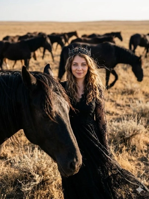 Close-up of a girl wearing a long black boho dress with lace sleeves, long wavy hair, a black crown on her head, standing among a flock of black horses on an arid steppe plain. There is a black horse in the foreground in close-up.low depth of field, cinematic composition, light wind, dress and mane in motion, realistic skin and wool texture, atmospheric, mystical and calm aesthetics, high resolution, detailed retouching, photorealism.