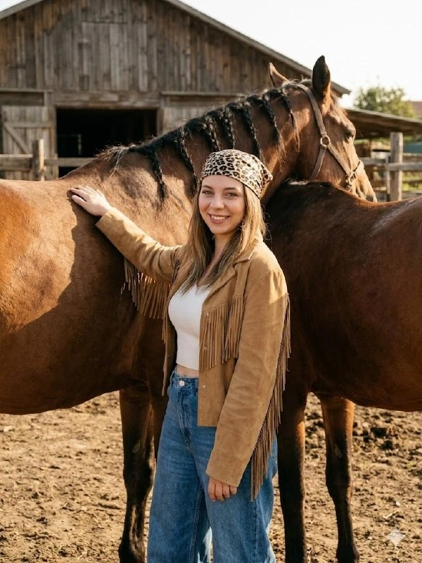 Create a portrait without changing your facial features. High-quality, lively Western-style street photography, shot in natural sunlight on a farm or ranch. In the frame, a young woman poses next to a large bay horse in a semi-open wooden enclosure. : A girl with a light tan and dark long hair. On his head (bandana scarf with leopard print). Posture: Stands in a relaxed, confident pose with his back pressed against the horse's side. The head is turned in profile, looking at the camera. His right hand is raised and casually rests on the horse's back. Clothes: A short oversized loose suede jacket in sandy beige with fringes on the sleeves, yoke and bottom, as well as decorative stitching. White basic cropped tank top (crop top). loose blue jeans A powerful bay horse (light brown) with very long, thick, braided hair. Natural sunlight. Rich natural shades: warm browns, beige, olive tones, contrasting with a white top and a bright mane. Genre: Street photography, country/Western style fashion photography. Slight natural film grain or digital noise is possible.