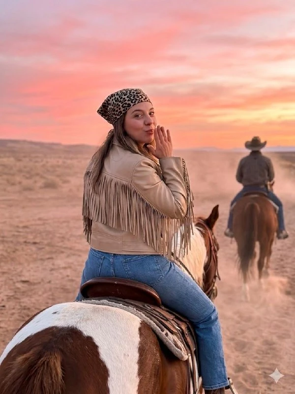 Create a portrait without changing your facial features. An atmospheric western-style shot taken from the back captures a girl riding a piebald horse through the desert at sunset. She's wearing a beige fringed jacket, jeans, and a leopard print bandana. She looks over her shoulder. She raises her palm to her lips, blowing a kiss. In the background, another horsewoman in a cowboy hat can be seen moving forward. The sky is painted in warm pink-orange tones, creating a soft contrast with the dry landscape. 4K