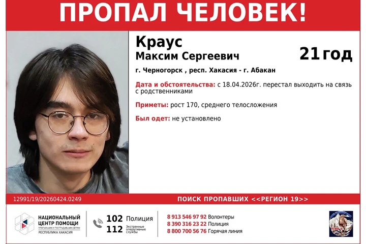 Тревожное сообщение от волонтеров общественной организации "Регион 19". Пропал 21-летний Максим Краус из Черногорска (Хакасия). С 18 апреля он не выходит на связь с родственниками.