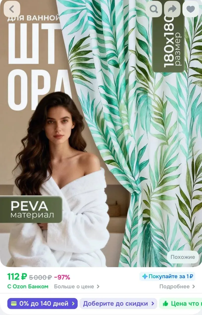 Шторка для ванной, занавеска в ванную комнату 180х180