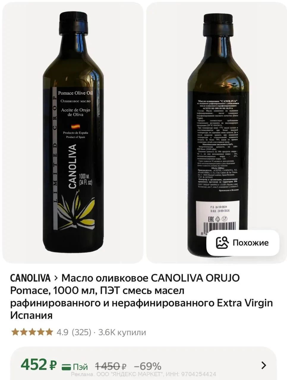 Масло оливковое CANOLIVA ORUJO Pomace, 1000 мл 👍