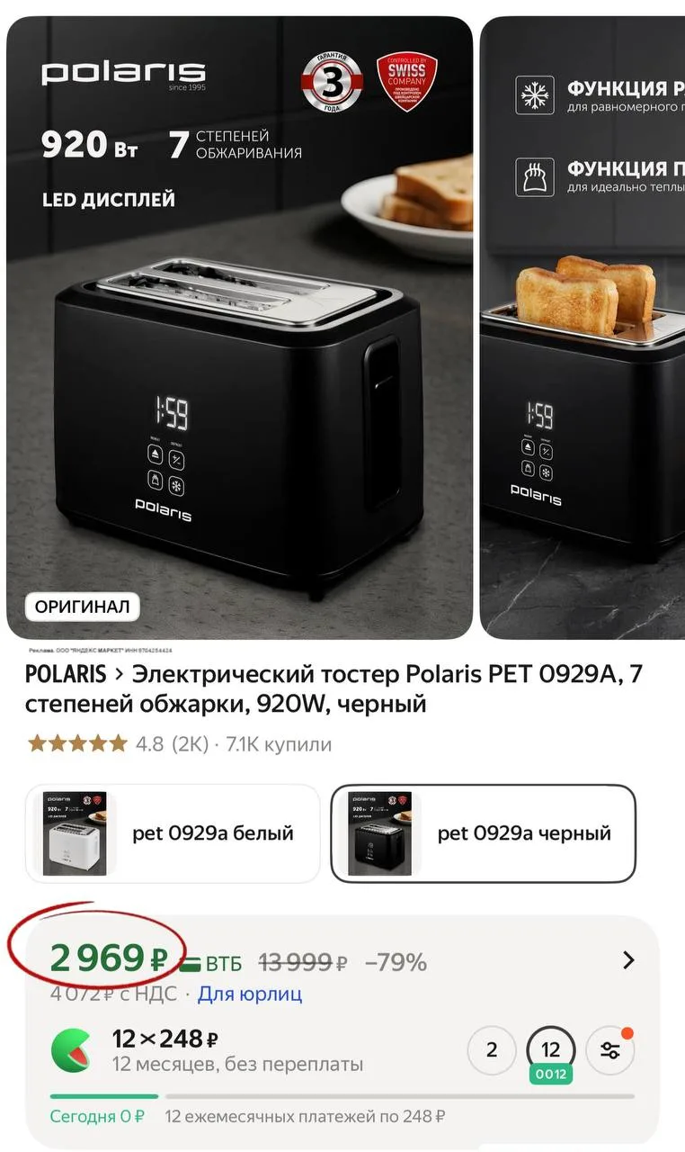 💻 Электрический тостер Polaris PET 0929A, 7 степеней обжарки, 920W, черный