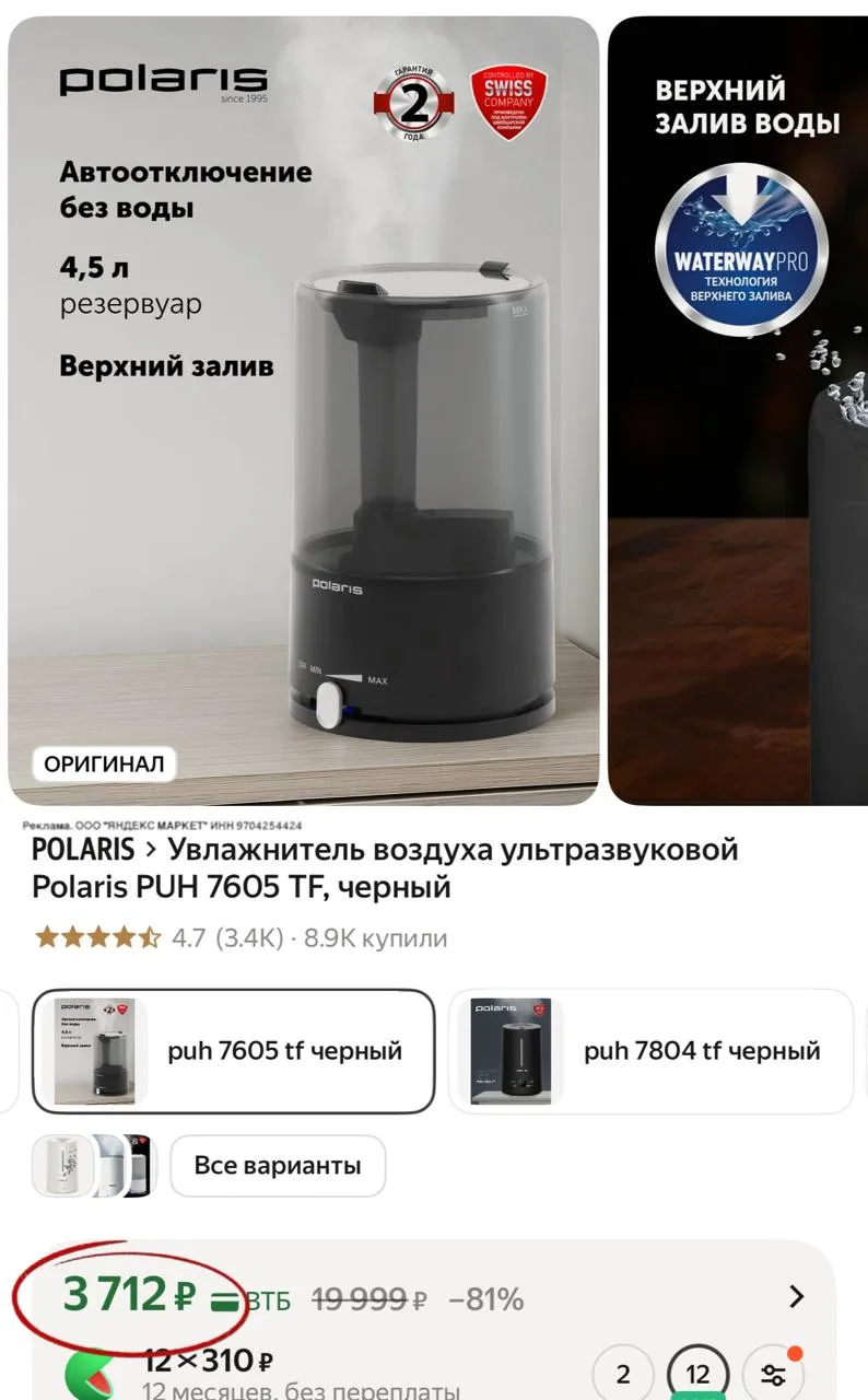 💻 Увлажнитель воздуха ультразвуковой Polaris PUH 7605 TF, черный