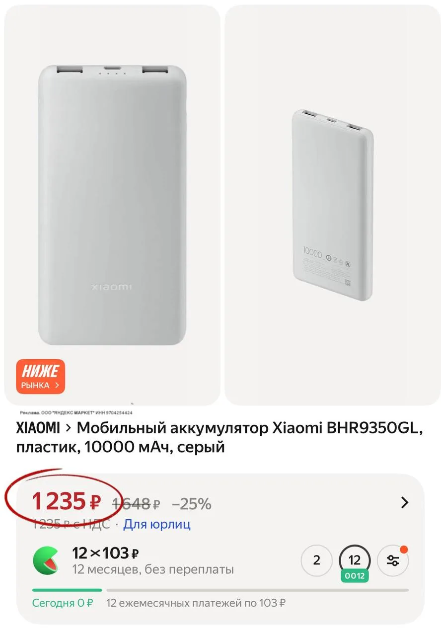 💻 Мобильный аккумулятор Xiaomi BHR9350GL, пластик, 10000 мАч, серый