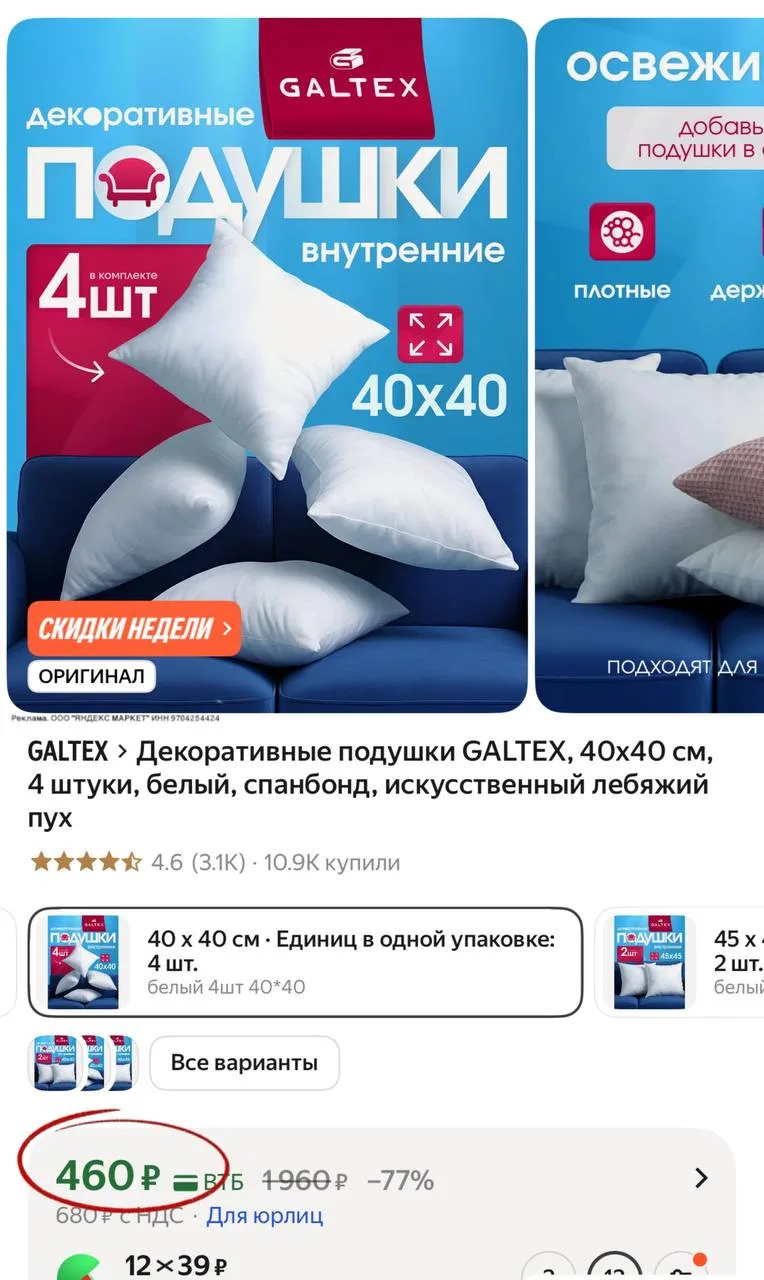 💻 Декоративные подушки GALTEX, 40x40 см, 4 штуки, белый, спанбонд, искусственный лебяжий пух