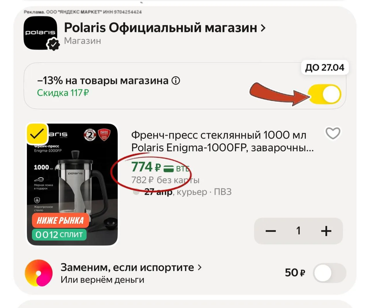 -13% скидка в корзине,нужно сдвинуть бегунок ⏺️