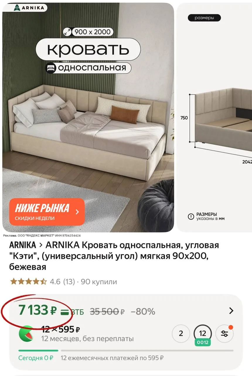 💻 ARNIKA Кровать односпальная, угловая "Кэти", мягкая 90х200, бежевая