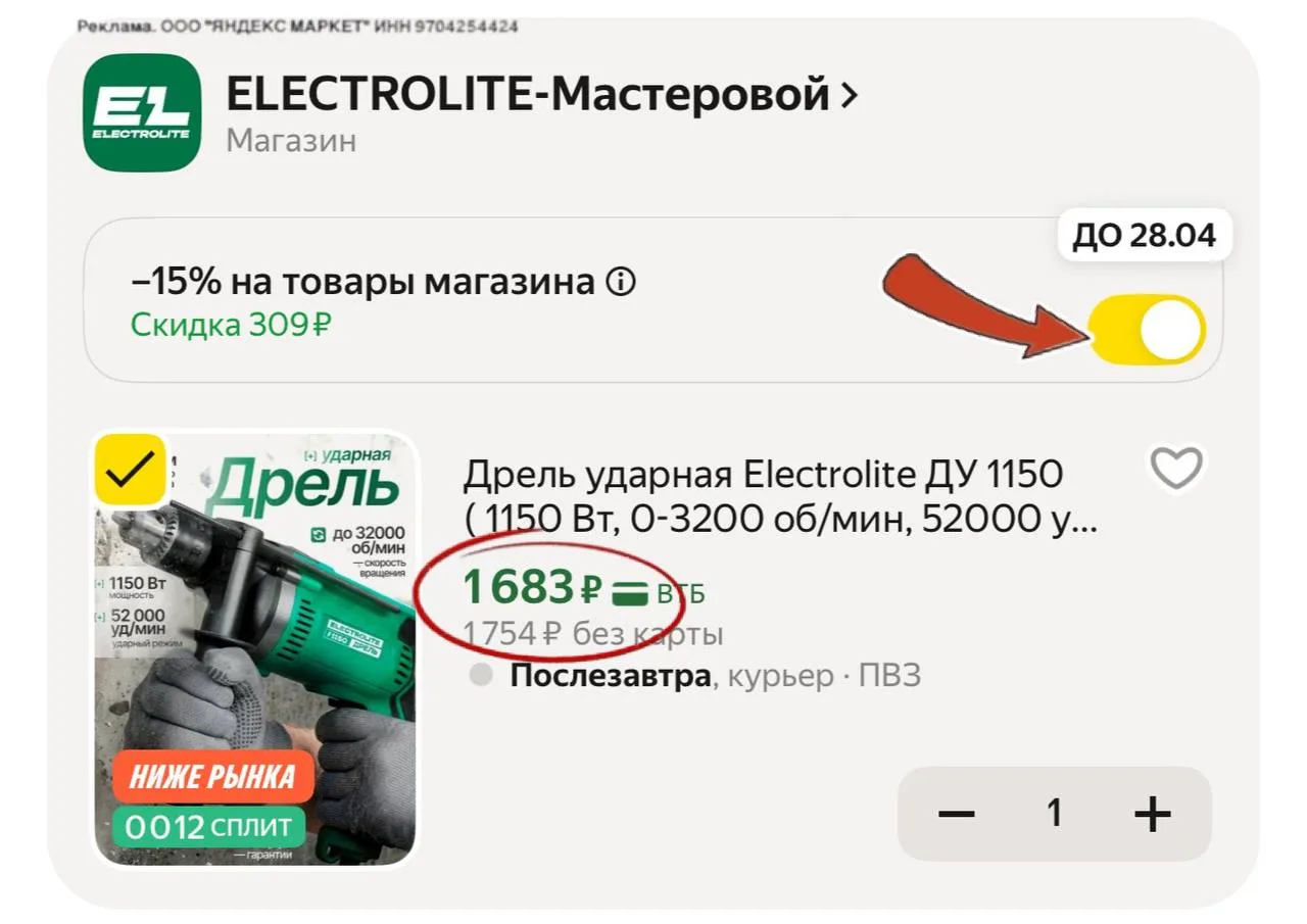-15% скидка в корзине,нужно сдвинуть бегунок ⏺️