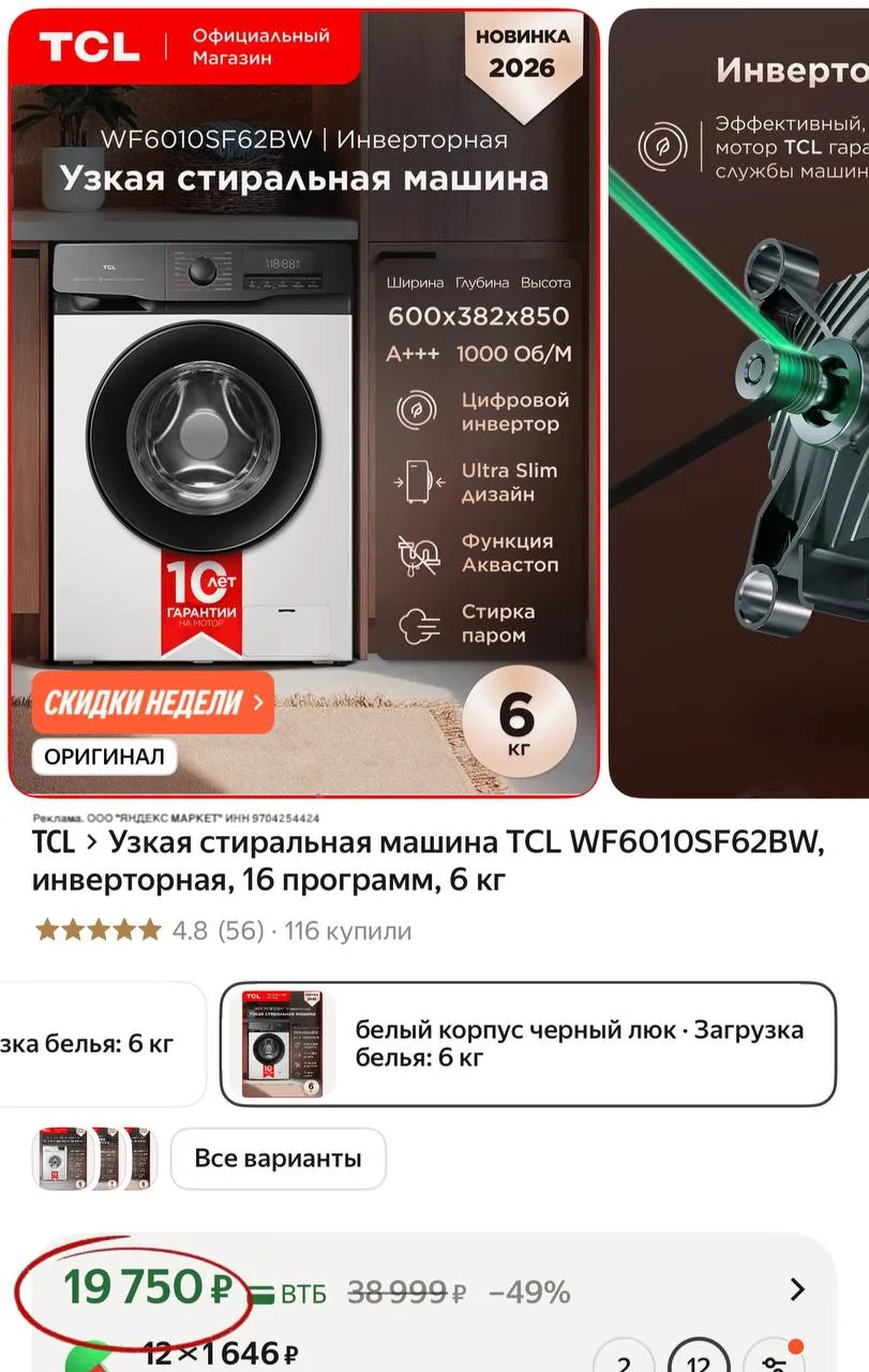 💻 Узкая стиральная машина TCL WF6010SF62BW, инверторная, 16 программ, 6 кг