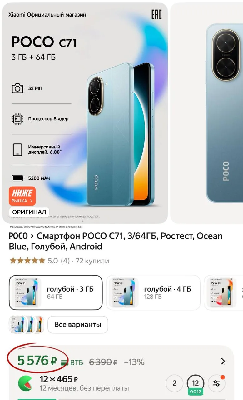 💻 Смартфон POCO C71, 3/64ГБ, Ростест, Ocean Blue
