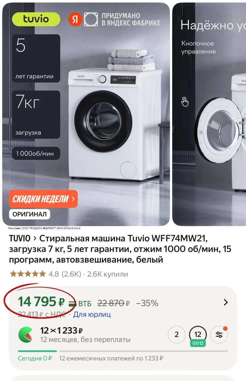 💻 Стиральная машина Tuvio 15 программ, автовзвешивание