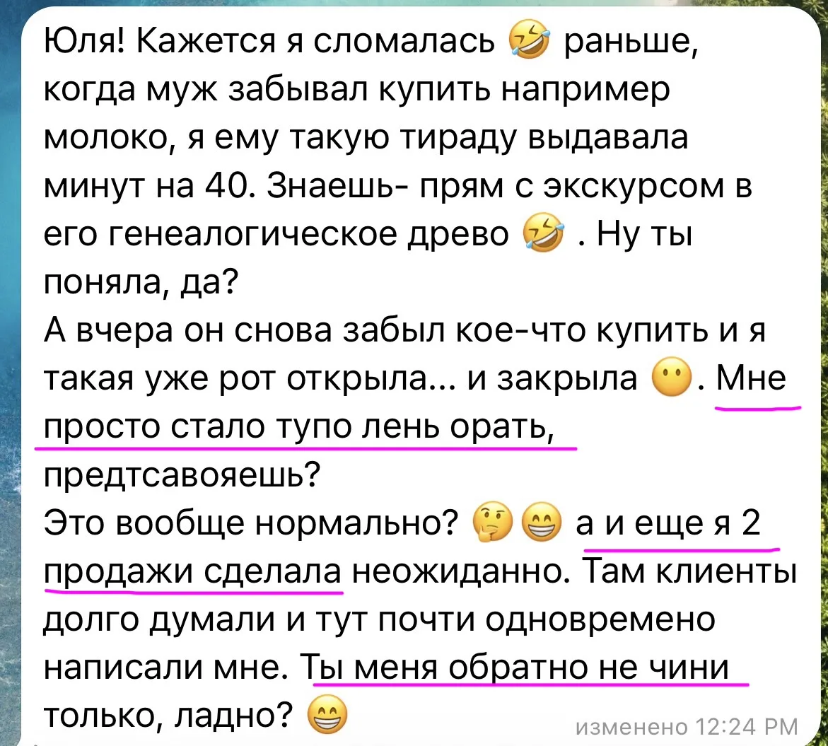 Юля! Кажется я сломалась 🤣 раньше, когда муж забывал купить например молоко, я ему такую тираду выдавала минут на 40. Знаешь- прям с экскурсом в его генеалогическое древо 🤣 . Ну ты поняла, да?