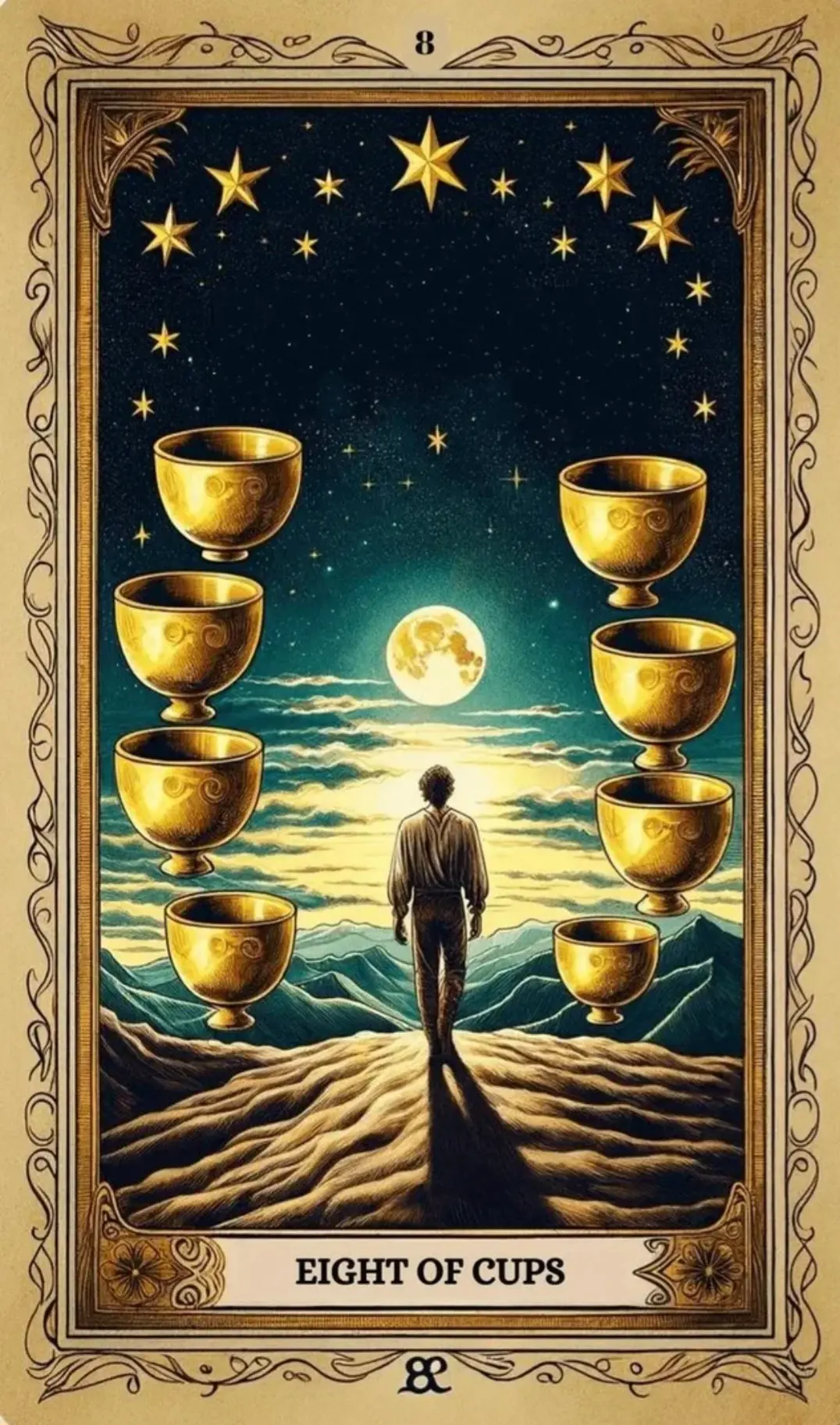 Сегодня вы можете почувствовать, что что-то уходит или перестает приносить радость. 8 Кубков — это не трагедия, а осознанный выбор. Вы словно поднимаетесь на вершину, оглядываетесь и понимаете: "То, что было раньше, меня больше не устраивает".