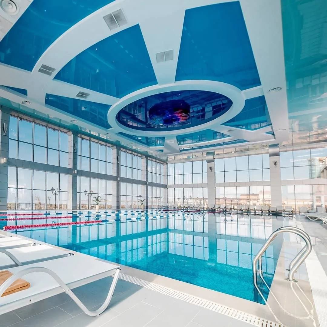 Есть крытый и открытый бассейны, зоны для отдыха, собственный песчаный пляж. Пологий вход в море делает его комфортным для семей с детьми.