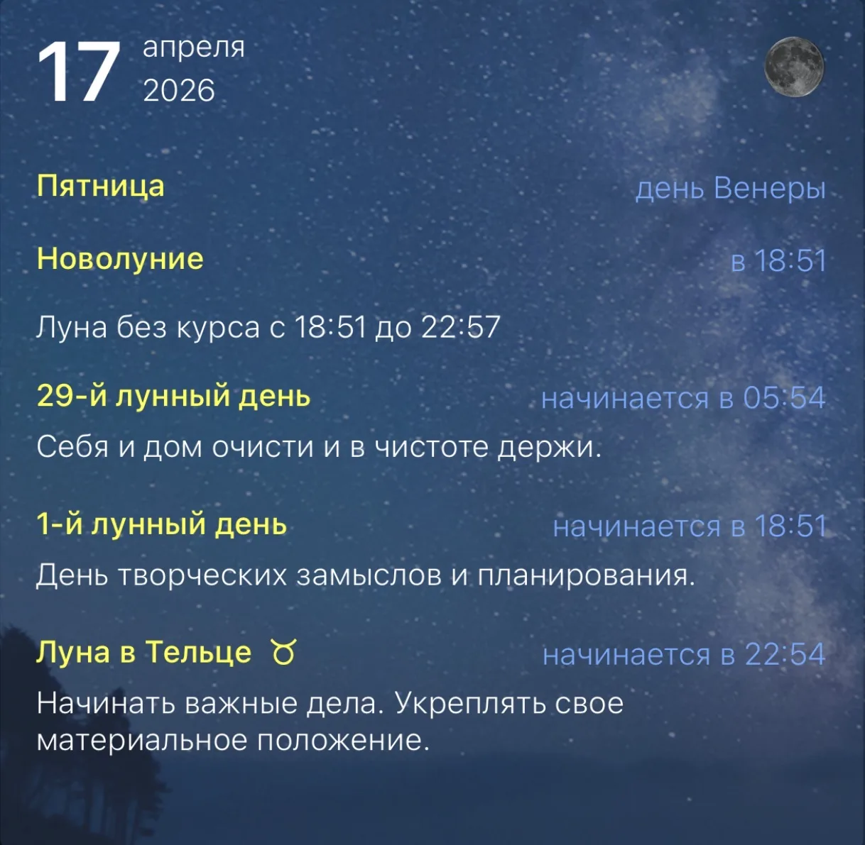 • Тишина. Новолуние — это «темная» фаза. Дайте себе хотя бы час полного информационного детокса. В этой тишине часто рождаются самые глубокие и настоящие ответы.