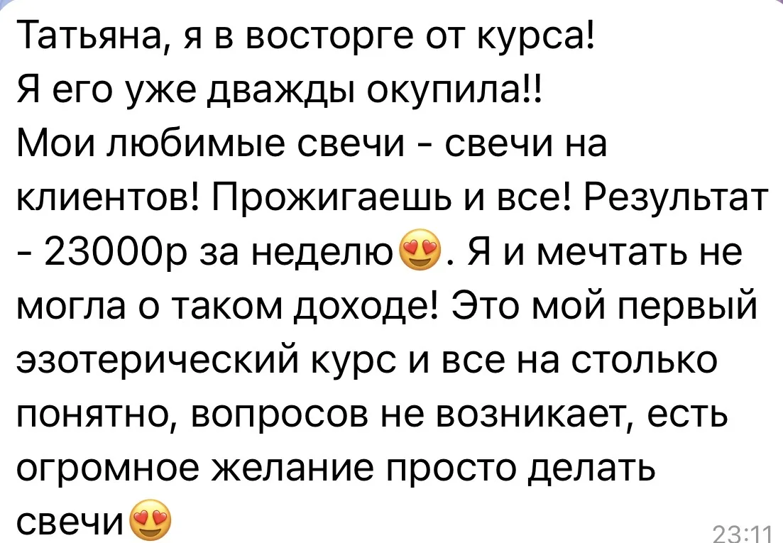 Кто-то получает «джекпот» в виде +23 000 рублей за неделю на свечах для клиентов. У кого-то мужья внезапно получают повышение зарплаты и сами начинают просить: «Сделай мне свечу на растущую луну!». Деньги — это энергия, и мы просто учимся её направлять.