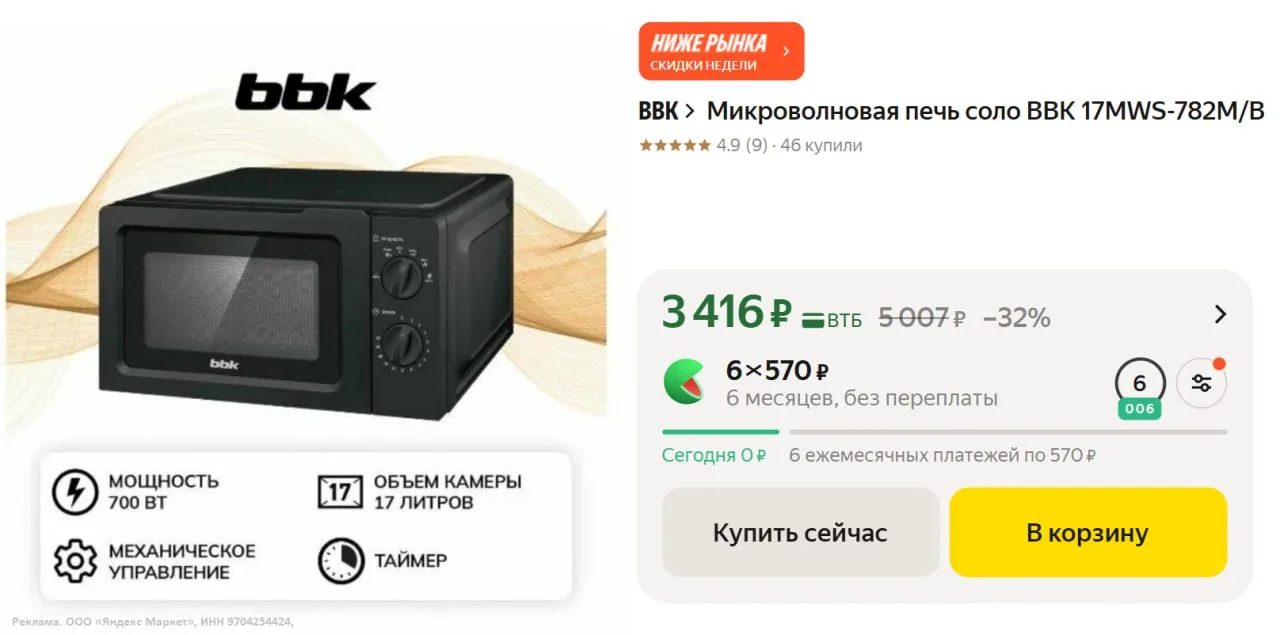 Микроволновая печь соло BBK 17MWS-782M/B за 3 416₽ — https://market.yandex.ru/cc/9EjrVG?erid=5jtCeReNx12oajxVWL1NqY7