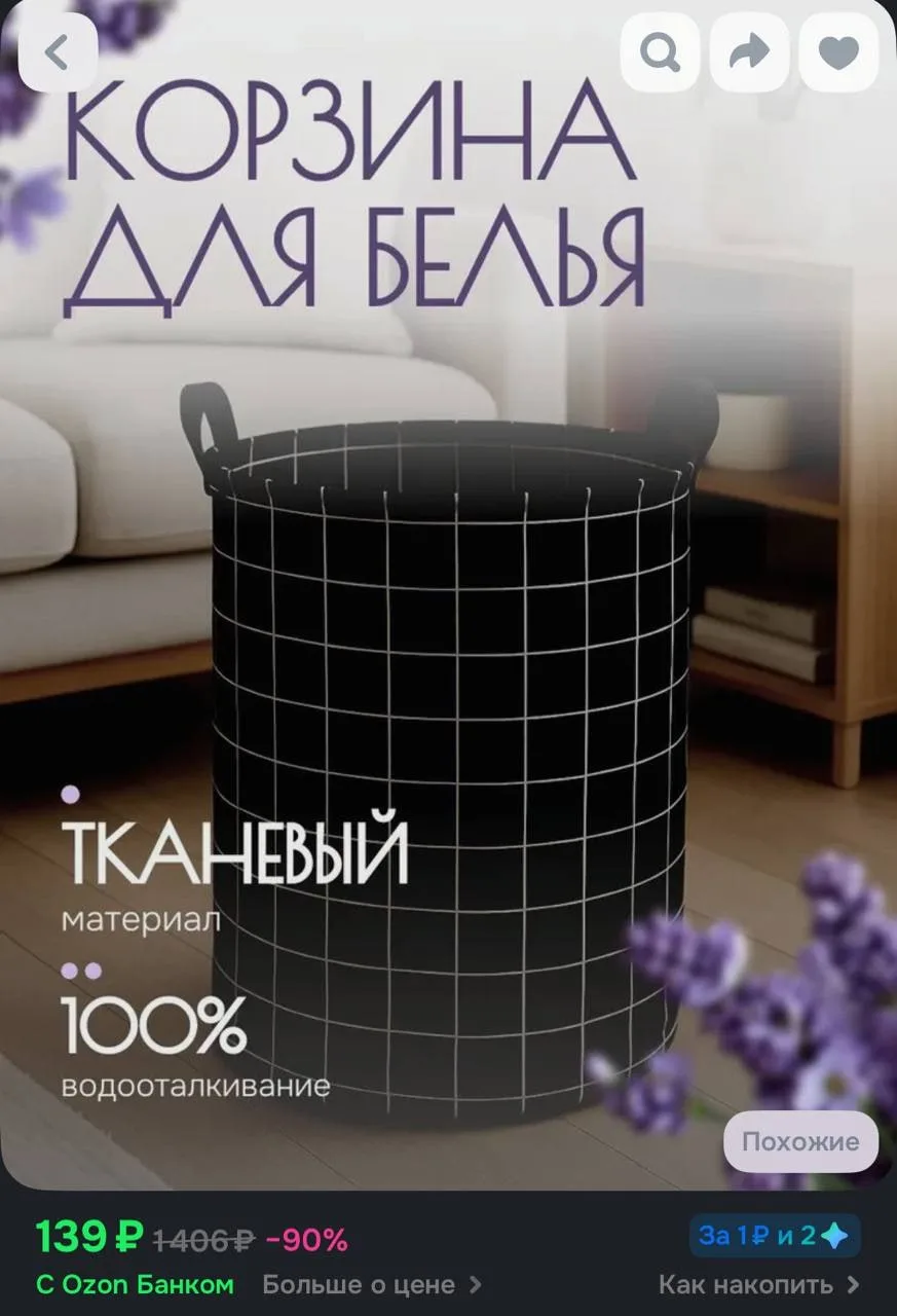 Корзина для белья тканевая 45 л за 139₽ — https://ozon.ru/t/Qi2mmJI