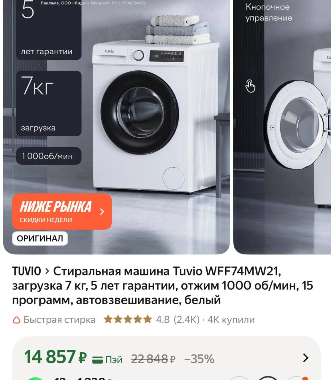 Стиральная машина Tuvio за WFF74MW21 за 14 857₽ — https://market.yandex.ru/cc/9Em8Xa?erid=5jtCeReNx12oajxVWL1PquW
