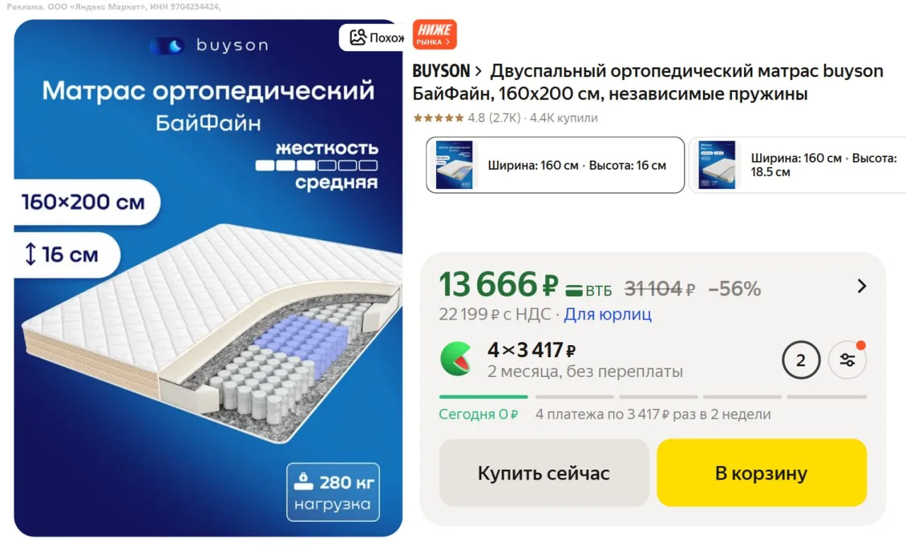 Двуспальный ортопедический матрас buyson БайФайн, 160х200 см, независимые пружины за 13 666₽ — https://market.yandex.ru/cc/9EnJjR?erid=5jtCeReNx12oajxVWL1QWVK