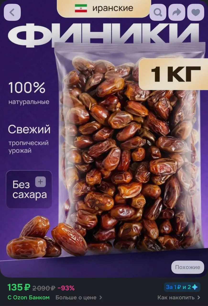 Финики Иранские Тропические 1000г за 135₽ — https://ozon.ru/t/d7gk250