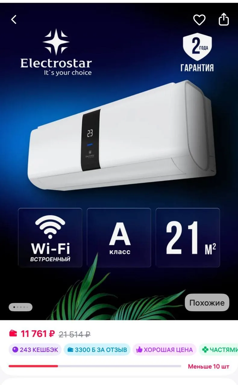 Electrostar Сплит-система кондиционер за 11 761₽ + 3 300 за отзыв — https://www.wildberries.ru/catalog/879536783/detail.aspx?size=1325781168